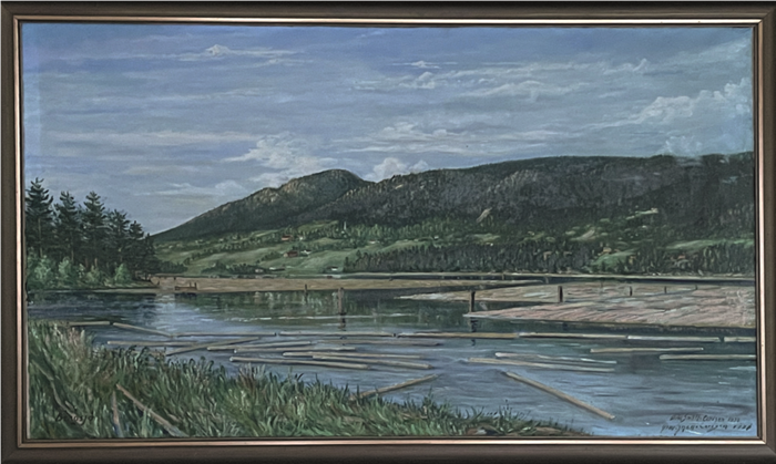 Tømmerfløting i Bergsjø, maleri av lokal kunstner Øiv. Snâll-Carlsen.